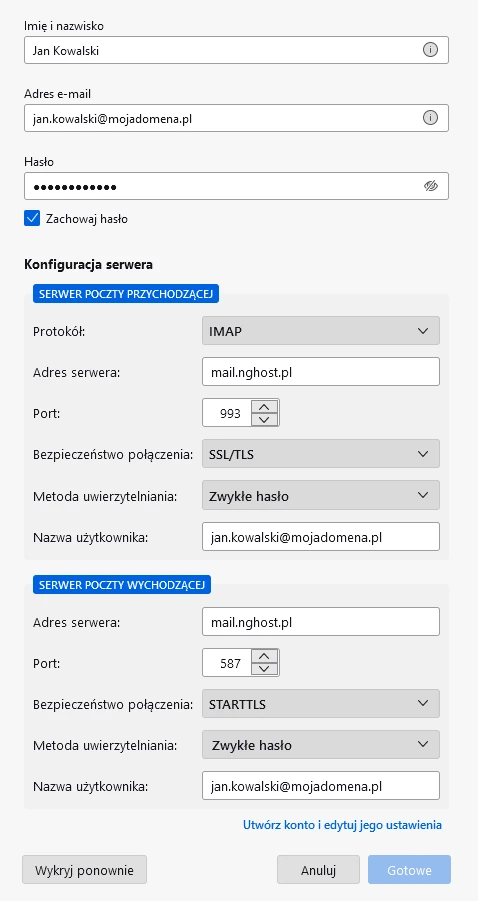 Dla programu Thunderbird w kreatorze dodawania konta, ustawienia powinny wyglądać tak: